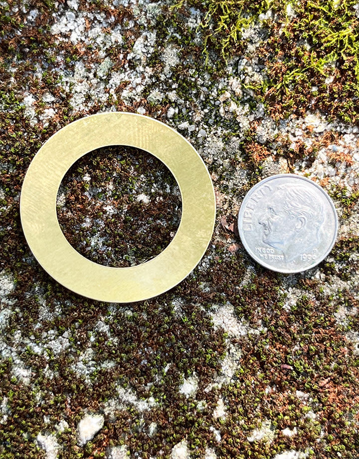 Brass washers are great to incorporate into your mixed media designs. Washer is 1-3/8" (34.9mm) in diameter with a 7/8" (21.9mm) hole. It is 2.0mm (12ga) thick.